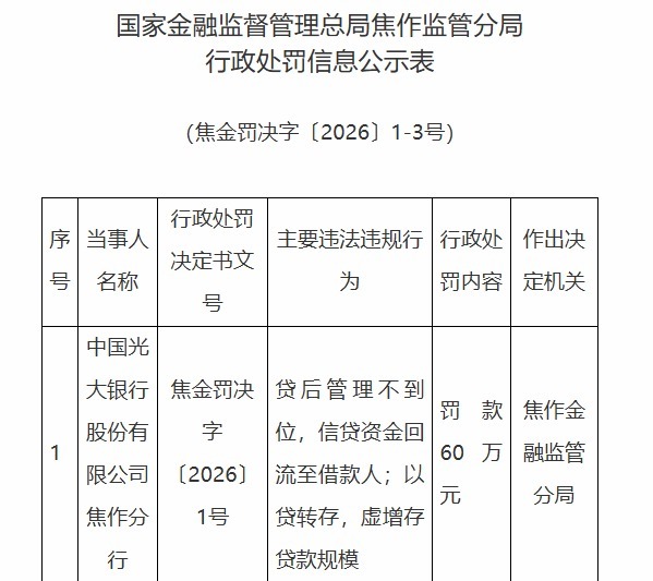 中国光大银行股份有限公司(简称“光大银行”,601818.SH)焦作分行存在以下不法违法事实:贷后处治不到位,信贷资金回流至借款东谈主;以贷转存,虚增存贷款鸿沟。焦作金融监管分局决定对其处以罚金60万元。
