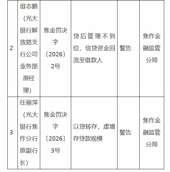 毋志鹏(光大银行目田路支行公司业务部原司理)存在以下不法违法事实:贷后处治不到位,信贷资金回流至借款东谈主。焦作金融监管分局决定对其处以劝诫。